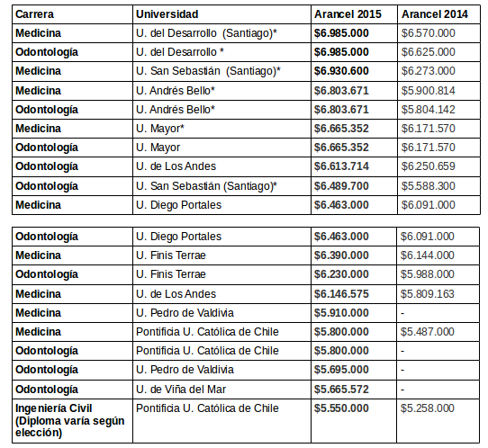Los aranceles de las carreras universitarias en Chile siguen subiendo, y este 2015 más de 10 superaron los 6 millones de pesos anuales.