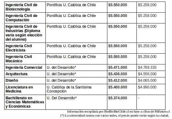 Las 30 carreras universitarias más caras de Chile en 2015