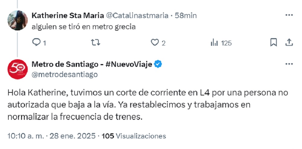 Tras ser consultados, la red subterránea publicó en X que “tuvimos un corte de corriente en L4 por una persona no autorizada que baja a la vía”, misma información que anunciaron por altoparlante a los demás pasajeros en el lugar.