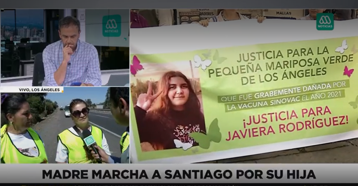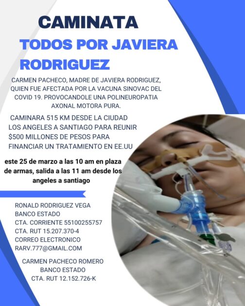 Javiera Rodríguez Pacheco se llama la hija de Carmen, quien en 2021, dos días después de ser inoculada con la vacuna Sinovac, exigida por el Gobierno para evitar el contagio de Covid-19, desarrolló una polineuropatía axonal motora pura.