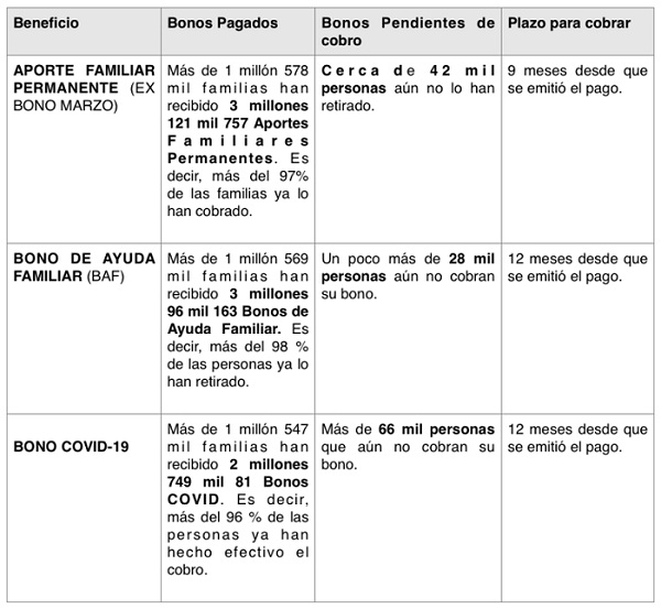 Para facilitar las consultas (que ya se pueden hacer en las páginas www.aportefamiliar.cl; www.bonoayuda.cl y www.bonocovid.cl) se dispuso el sitio www.bonospendientes.cl.