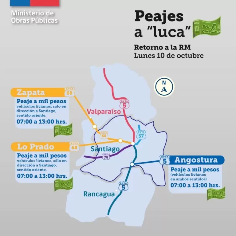 Por ello, entre las 7:00 y las 13:00 de este lunes habrá peaje a $1.000 en Angostura de la Ruta 5 Sur en ambos sentidos, para vehículos livianos; mientras que en la misma hora, y en los peajes Zapata y Lo Prado de la Ruta 68, habrá el mismo beneficio, pero solo en dirección a Santiago.