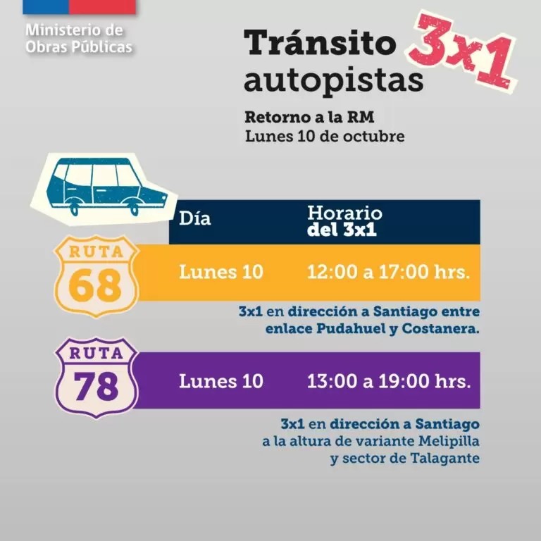 Junto con ello, habrá 3×1 en dirección a Santiago el lunes 10 en la Ruta 68 y 78. En la primera será entre las 12:00 y las 17:00 entre el enlace Pudahuel (km 11,6) y Costanera (km 9,5); mientras que en la segunda será entre la variante Melipilla (km 63,3) y sector de Talagante (km 39,3) de 13:00 a 19:00.