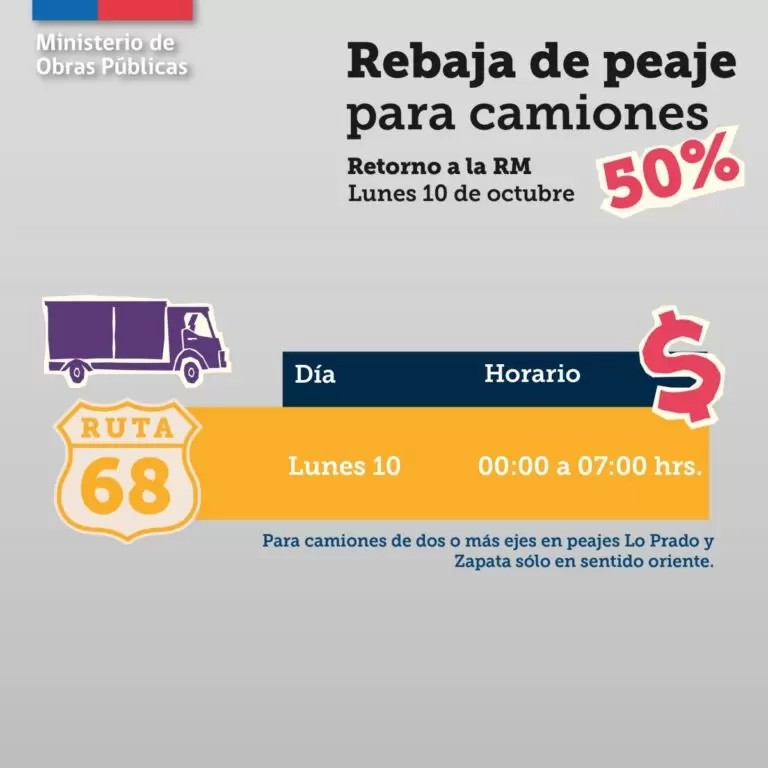 Finalmente, habrá peaje rebajado en un 50% para los camiones en la Ruta 68, en Lo Prado y Zapata, esto en dirección a Santiago entre las 0:00 y las 7:00 del lunes 10.