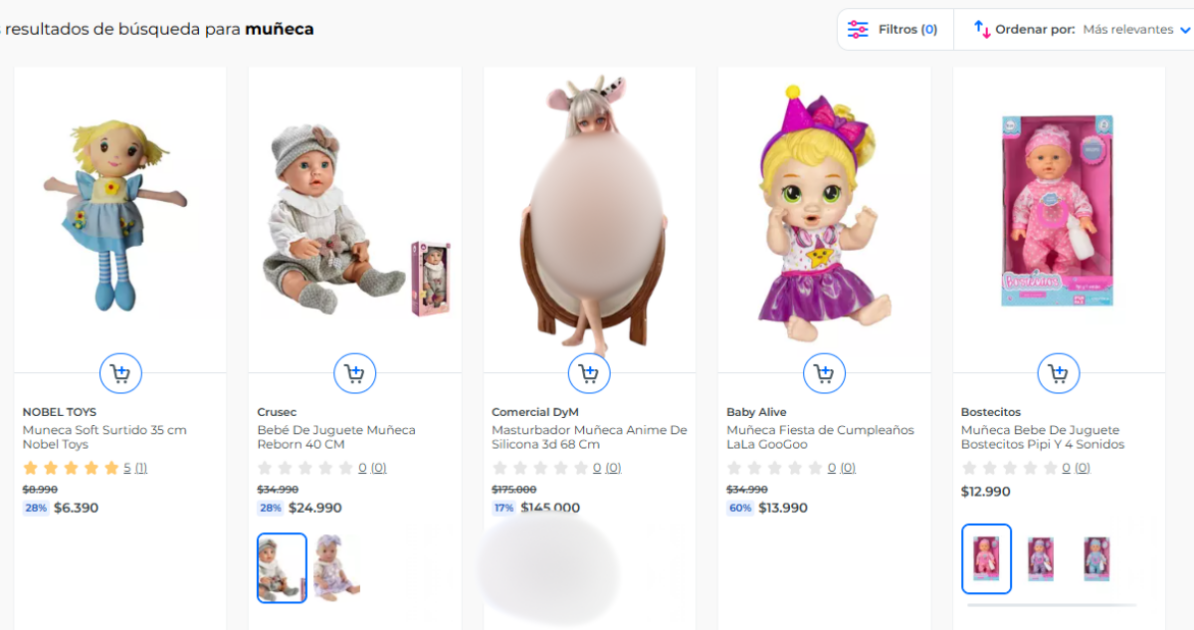 Un insólito hecho dejó en evidencia este lunes una mujer que denunció la venta de una muñeca inflable entre juguetes de niños en la página web de tiendas Paris, de Cencosud.