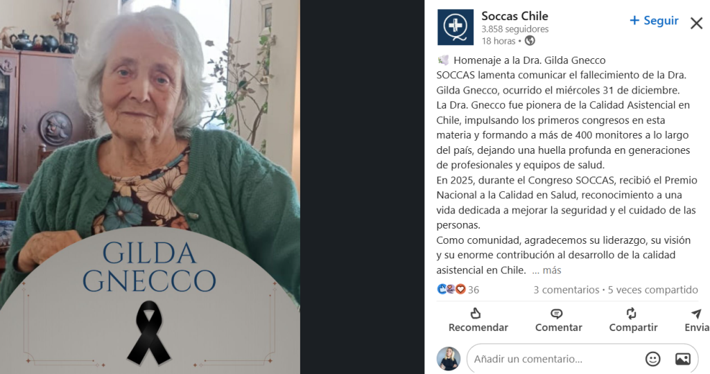 Su aporte a la salud fue reconocido también por la Sociedad Chilena de Calidad Asistencial (SOCCAS), que rindió homenaje a su trabajo. La organización destacó que la Dra. Gnecco fue pionera de la Calidad Asistencial en Chile, impulsó los primeros congresos en esta materia y formó a más de 400 monitores a nivel nacional.