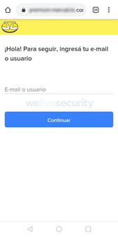 Al acceder desde el dispositivo móvil al falso sitio, la campaña fraudulenta comienza a recolectar datos de las víctimas. Primero solicita ingresar la dirección de correo o nombre de usuario y la contraseña para acceder a la plataforma.