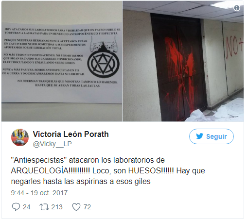 Además, dejaron un panfleto que dice “hoy atacamos sus laboratorios para visibilizar que en Facso ‘UShile’ se torturan a las ratas para un beneficio antropocéntrico y especista”.