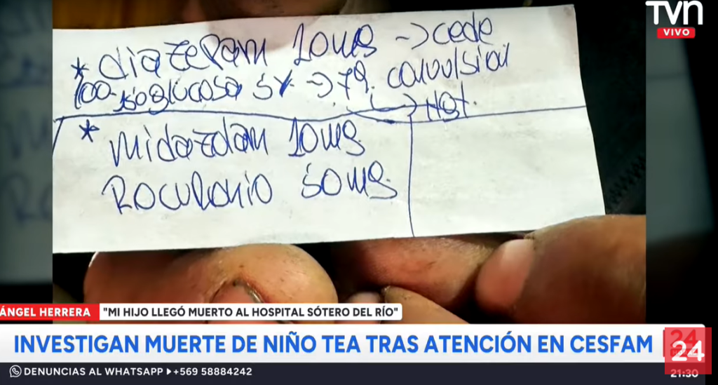 Según un papel que le otorgó una paramédico del hospital, al niño le aplicaron diazepam, midazolam y rocuronio, por vía intravenosa. “Ella me indicó que me lo habían matado allá”, expresó el papá de Cristián.