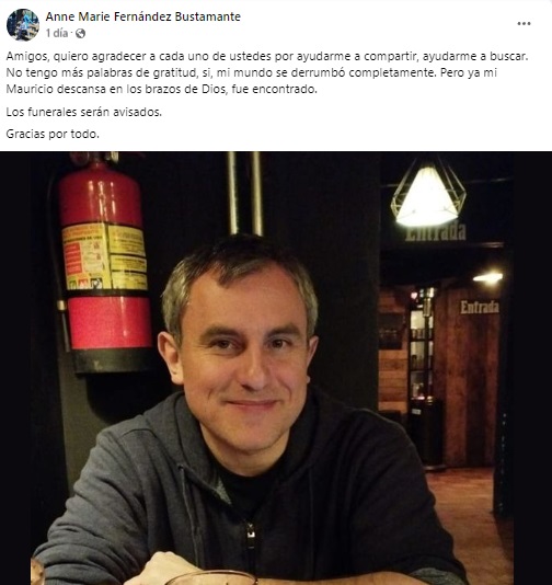 “Mi mundo se derrumbó completamente. Pero ya mi Mauricio descansa en los brazos de Dios, fue encontrado“, sostuvo la mujer, mediante sus redes sociales.