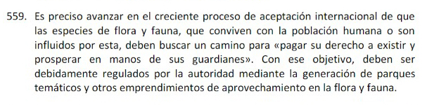 En ese sentido, el texto agrega que “deben ser debidamente regulados por la autoridad mediante la generación de parques temáticos y otros emprendimientos de aprovechamiento en la flora y fauna”.