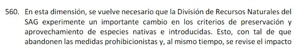 A esta iniciativa se añade el punto 560, que llama a la División de Recursos Naturales del SAG a experimentar “un importante cambio en los criterios de preservación y aprovechamiento de especies nativas e introducidas”.