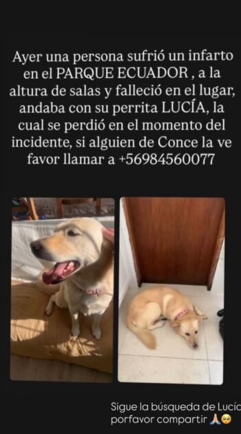 “Ayer una persona sufrió un infarto en el Parque Ecuador, a la altura de Salas, y falleció en el lugar. Andaba con su perrita, Lucía, la cual se perdió en el momento del incidente”, señaló la madre de una de sus alumnas, quien además compartió un número de contacto para facilitar su búsqueda.