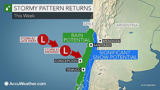 Un pronóstico similar dio a conocer el servicio norteamericano AccuWeather, que asegura serían dos los eventos meteorológicos que traerán intensas lluvias a Santiago y la zona central, uno a mediados de semana y el segundo durante el término.