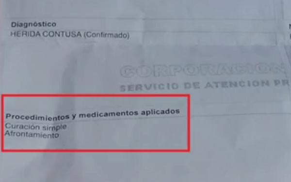 Y agregó: “Luego se acerca otro auxiliar médico, indicándome que no podían realizar la curación porque los insumos estaban con llave”, a pesar de que le estaban poniendo puntos a otro paciente, como revela el video. Ante su insistencia, amenazaron con llamar a Carabineros para sacarlo del lugar.