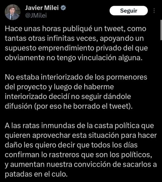 “El mundo quiere invertir en Argentina. $LIBRA”, decía el tuit del mandatario, publicado el pasado viernes.