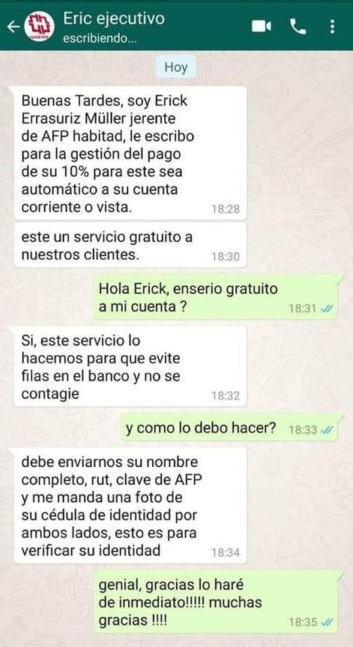 Es que hace un tiempo a través de WhatsApp, surgieron cientos de “ejecutivos de AFP” que contactaban a beneficiarios para solicitarles: nombre completo, RUT, clave de AFP y hasta foto del carnet por ambos lados.