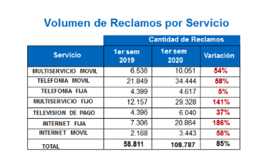 Durante el primer semestre de este año, se recibieron 108.787 reclamos por parte de los usuarios. Esta cifra es un 85% mayor en comparación con lo registrado durante el mismo período de 2019 cuando se recepcionaron 58.811 reclamos.