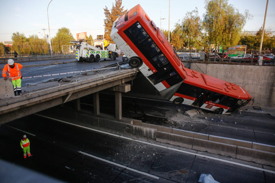 Los equipos de emergencia y socorro desplegados en el lugar trabajaron con grúas para retirar el bus del sitio, y poder habilitar el tránsito en la Autopista Central, altamente concurrida.