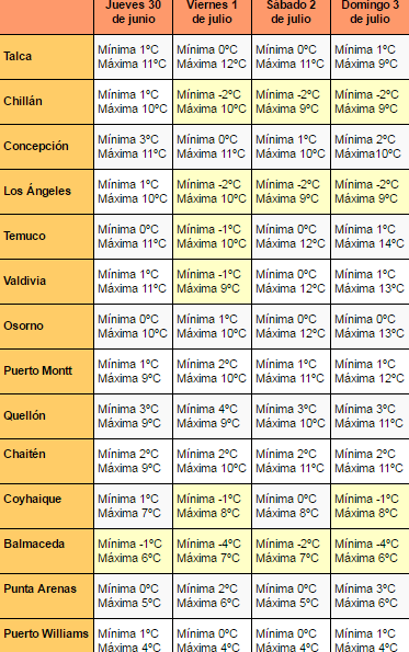 En el siguiente cuadro puedes revisar las temperaturas mínimas y máximas por comuna que se registrarán entre este jueves y domingo en las zonas centro sur, sur y austral, las cuales fueron informadas por la Dirección Meteorológica de Chile: