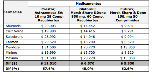 Según la cadena donde se comercializa, el Sernac indicó que la mayor diferencia absoluta en un medicamento resultó ser “el producto Crestor, laboratorio Astrazeneca, de 10 Mg., en presentación de 28 comprimidos recubiertos”. La diferencia en su valor fue de “hasta $11.510(57,6%), con un mínimo de $19.990 registrado en farmacia Cruz Verde y el máximo precio de $31.500 en farmacia Mendoza”.