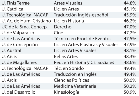 La información fue recogida por el diario Las Últimas Noticias y arrojó una triste realidad: el ránking es encabezado en los tres primeros lugares por Teatro, exactamente el programa que se imparte en la Universidad Arcis, la UNIACC y la Universidad del Desarrollo.