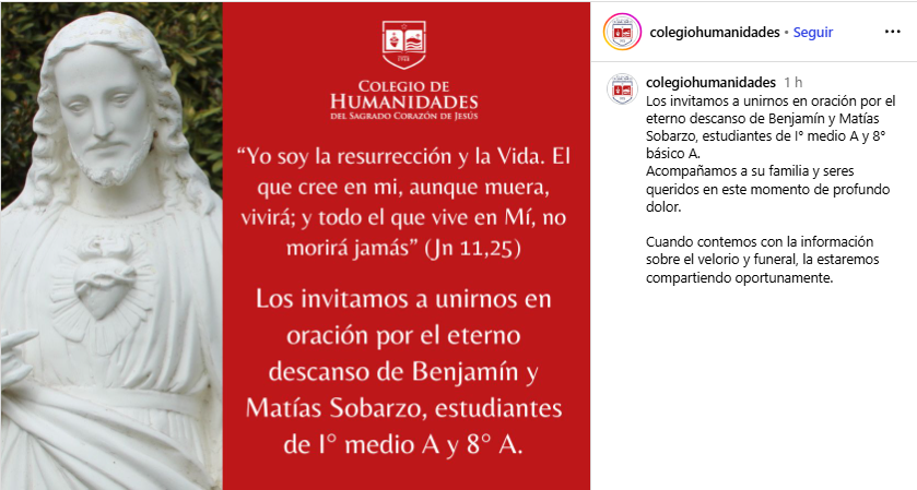 Desde el recinto educacional donde estudiaban los niños, invitaron a la comunidad “a unirnos en oración por el eterno descanso de Benjamín y Matías Sobarzo, estudiantes de I° medio A y 8° básico A. Acompañamos a su familia y seres queridos en este momento de profundo dolor”.