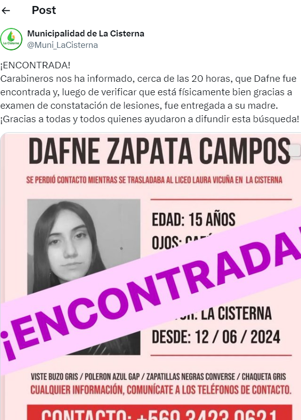 “¡Encontrada! Carabineros nos ha informado, cerca de las 20:00 horas, que Dafne fue encontrada y, luego de verificar que está físicamente bien gracias a examen de constatación de lesiones, fue entregada a su madre”, anunciaron en el post.
