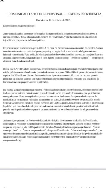 El comunicado también cuestiona declaraciones atribuidas a la jefa del Departamento Jurídico Municipal, quien habría señalado que la decisión busca “dar un mensaje claro” y “marcar un precedente”, lo que los dueños del café calificaron como “una declaración inaceptable”.