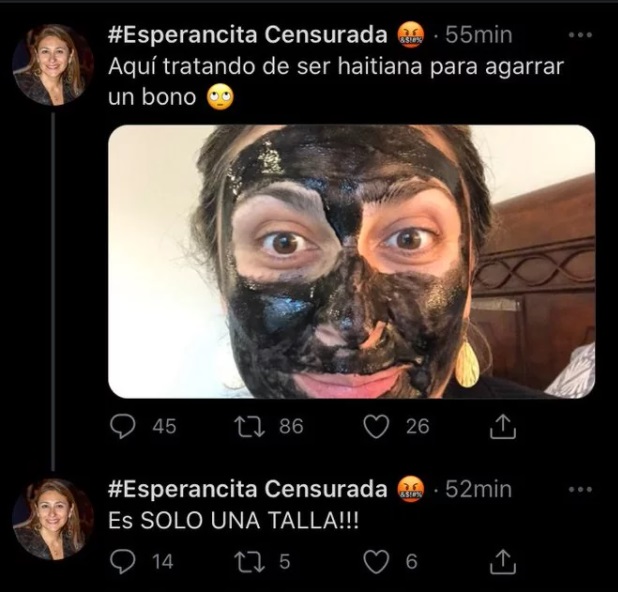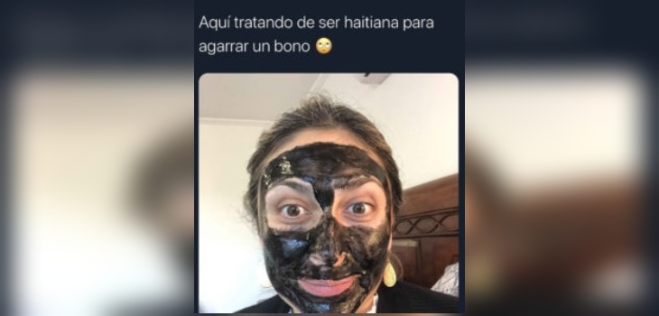“Aquí tratando de ser haitiana para agarrar un bono”, compartió la anestesista Magaly Obregón Ampuero, adjuntando además una foto con su rostro cubierto con una máscara facial de carbón.