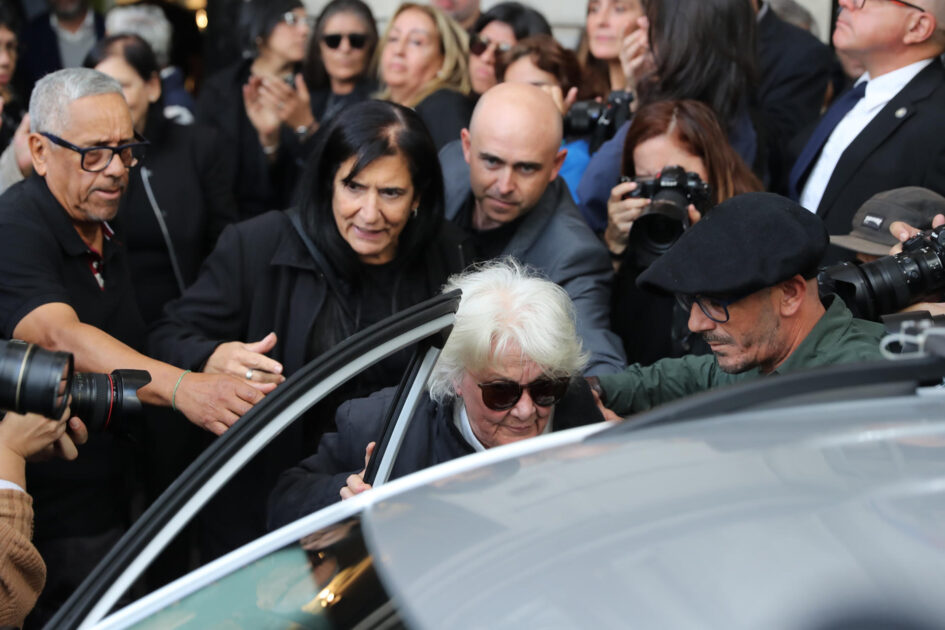 A pocos metros de la salida, en la puerta del Palacio Estévez, el actual mandatario, Yamandú Orsi, acompañado por la viuda de Mujica, Lucía Topolansky, colocó el pabellón patrio sobre el féretro, que avanzaba en una cureña.