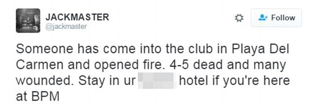“Alguien entró al club en Playa del Carmen y comenzó a disparar. 4-5 muertos y muchos heridos. Quédense en sus putos hoteles si están aquí por el festival BPM. Al parecer hay más disparos en otro club de la zona”, fueron las palabras del británico.