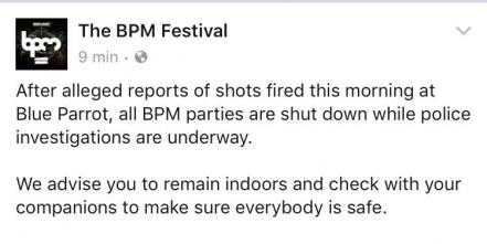 En el breve comunicado colgado en Twitter se leía: “Tras los reportes de tiroteos ocurridos esta madrugada en el Blue Parrot, todas las fiestas se cancelaron en tanto se desarrollan las investigaciones policíacas. Llamamos a los asistentes a mantenerse en interiores y en contacto con sus acompañantes”.