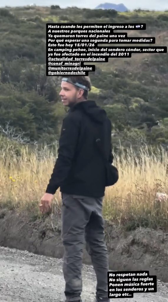 Lucas Martínez, autor del video, cuestionó en sus redes el ingreso de turistas israelíes. “Ya quemaron Torres del Paine una vez”, escribió en alusión al incendio de 2011 provocado por Rotem Singer. Martínez contó al mencionado medio de comunicación que el episodio ocurrió el 15 de enero en el Camping Pehoé, al inicio del sendero Cóndor.