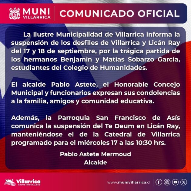 Cabe resaltar también, que ante la lamentable tragedia, la Municipalidad de Villarrica determinó la suspensión de los desfiles de Fiestas Patrias programados para este del 17 y 18 en Villarrica y Licán Ray.