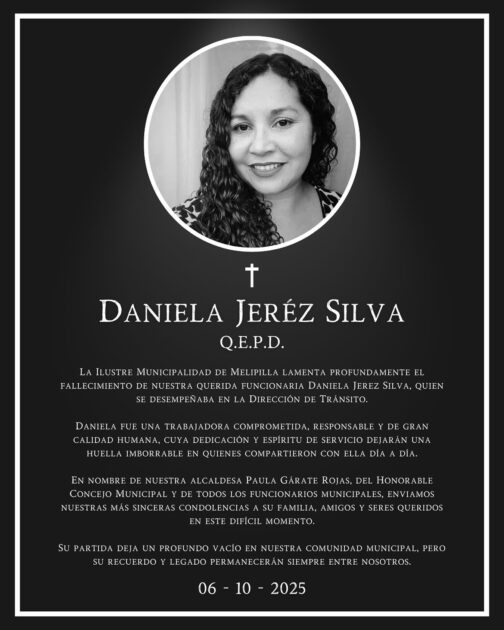 “Con profunda tristeza nos toca, como equipo y como Municipalidad de Melipilla, despedir a Daniela Jerez Silva (Q.E.P.D.), una querida funcionaria que durante 11 años entregó con dedicación y cariño su trabajo al servicio de nuestra comunidad”, señalaron.