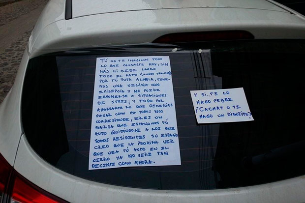 No fue lo único que hicieron: también una mujer anónima le dejó una larga carta enganchada al parabrisas: “Tu no te imaginas todo lo que causaste hoy, sin más mi bebé lloró todo el rato (quedó traumado) por tu puta alarma (…) y todo por ahorrarte lo que deberías pagar como a todos nos corresponde, eres un barsa estacionando tu auto quitándole el espacio a los que somos residentes”.