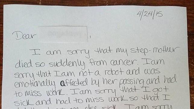 Sin identificarse con su nombre real, la usuaria “gahdzuks” exhibió en la plataforma social Reddit, el escrito que entregó a sus empleadores una vez que estos no toleraran su ausencia laboral, pese a que existían motivos de peso para ello.