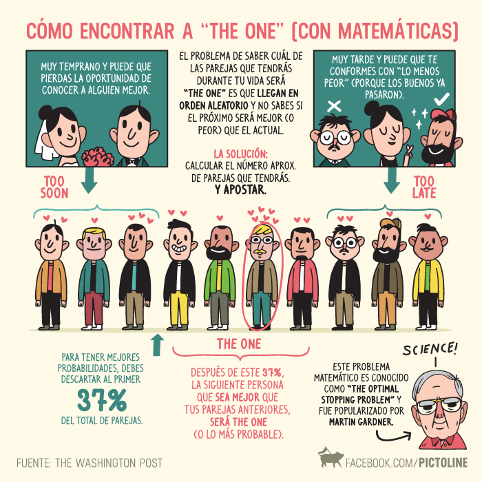 Después de ese 37% de descartados, la siguiente persona, es la que que tiene más probabilidades de ser la pareja ideal. Ni muy temprano para perder la oportunidad de conocer a alguien mejor, ni muy tarde para conformarse con “lo menos peor”.