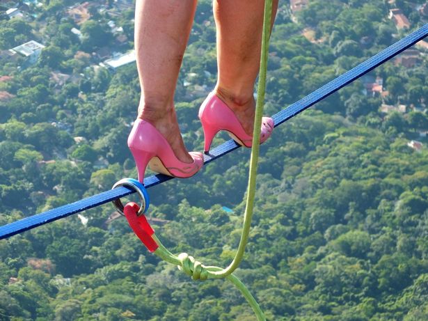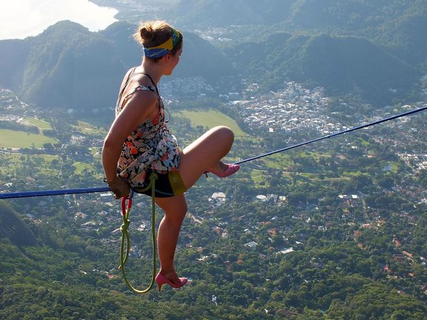 La joven de 26 años y proveniente de la ciudad texana de Austin, superó a la muerte usando unos tacos rosados, durante el Festival Highgirls Brazil. La mujer ejecutó la hazaña a 840 metros sobre el nivel del mar usando sólo una cuerda de seguridad, en caso de perder el equilibrio.