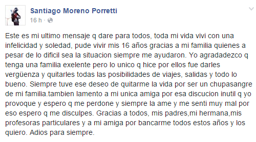 “Este es mi último mensaje que daré para todos. Toda mi vida viví con una infelicidad y soledad. Pude vivir mis 16 años gracias a mi familia, quienes a pesar de lo difícil sea la situación, siempre me ayudaron. Yo agradezco que tenga una familia excelente, pero lo único que hice por ellos fue darles vergüenza y quitarles todas las posibilidades de viajes, salidas y todo lo bueno”, detalló en esta red social.
