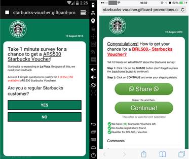 En el mensaje se ofrece un descuento de Starbucks de $500 en la moneda local para comprar en sus cafeterías, tal como consigna BioBioChile. A cambio de esta “oferta”, se pide contestar una encuesta guardada en un link, cuyo único fin es sustraer datos como mail y nombre para darle un mal uso.