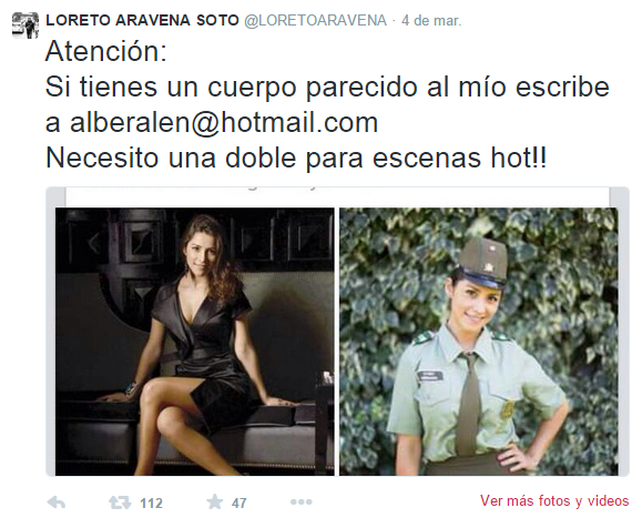 El martes, una conocida actriz chilena publicó una inusual oferta de trabajo en Twitter, que rápidamente se viralizó en esta red social. Se trata de Loreto Aravena (Los 80, Chipe Libre, Soltera Otra Vez) quien andaba buscando con urgencia una doble de cuerpo.