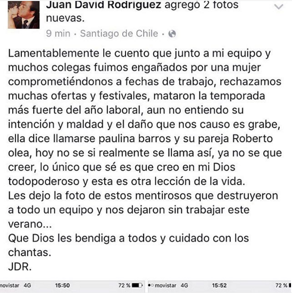 Tras descubrir que fueron estafados, inmediatamente empezaron a publicar en sus redes sociales el rostro y el nombre de la mujer que les jugó esta mala pasada, justo a fin de temporada, cuando los eventos veraniegos están a la orden del día. Tristemente estos rostros no pudieron aprovecharlo por culpa de esta trampa.