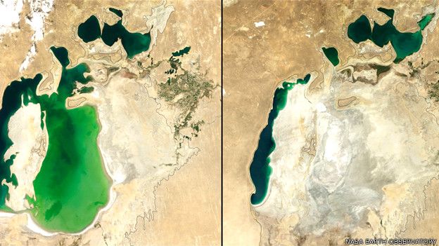 Hace 40 años, este mar estaba repleto de botes, pescadores y fauna, pero desde la década del 60 comenzó a secarse, al punto de que sólo quedan dos tristes segmentos separados: el Mar de Aral del Norte y el del Sur. La última imagen es del 2014.