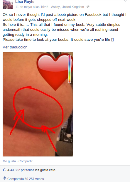 “Ok, nunca pensé que iba a postear una fotografía de un seno en Facebook pero creo que es mejor hacerlo ahora, antes de que me lo extirpen la próxima semana. Así que aquí está… esto es todo lo que encontraron en mi seno. Unos hoyuelos casi imperceptibles bajo él que fácilmente podrían pasar desapercibidos cuando estamos apuradas arreglándonos cada mañana. Por favor, tómense un tiempo de observar sus pechos, les podría salvar la vida”