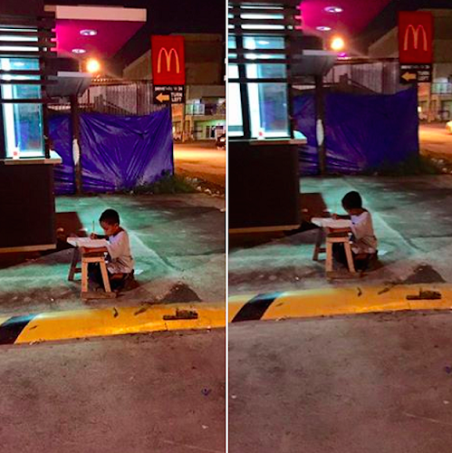 Este semana, una imagen tomada en Filipinas conmovió el corazón de miles. En esta, se podía ver a un pequeño niño estudiando y haciendo las tareas para su colegio apenas iluminado por la vitrina de un restaurante de la cadena de comida rápida McDonald’s. La foto fue posteada por una estudiante de Mandaue City llamada Joyce Torrefranca (23), quien afirmó haber sido “inspirada por un niño”.