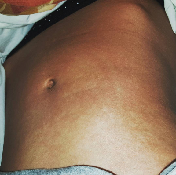 La influenza que aqueja a la modelo desató una fuerte fiebre, que a su vez produjo esa especie de alergia que tiene su piel granulosa y un tanto inflamada.
