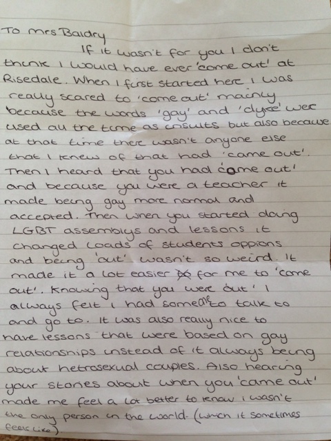 si no fuera por usted, creo que jamás habría ‘salido del closet’ en Risedale. Cuando llegué aquí estaba asustada de ‘salir’ en gran medida porque las palabras ‘gay’ y ‘lesbiana’ eran usados en ese tiempo como insultos, pero además porque nadie más que conociera hubiese ‘salido del closet’.Después escuché que usted lo hizo y como es una profesora, lo hizo más normal y aceptable. Después, usted comenzó a llevar a cabo asambleas y lecciones LGBT (siglas que designan colectivamente a lesbianas, gays, bisexuales y transexuales) y esto cambió la opinión de muchos estudiantes y ‘asumir’ ya no era tan raro. Esto hizo mucho más fácil para mí lograrlo.