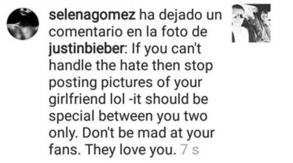 “Si no puedes soportar el odio, entonces deja de publicar fotos de tu novia. (Risa). Debería ser algo especial sólo entre ustedes dos. No te enojes con tus fans. Ellas te aman”, escribió amablemente Selena, aunque con algo de notable sarcasmo.